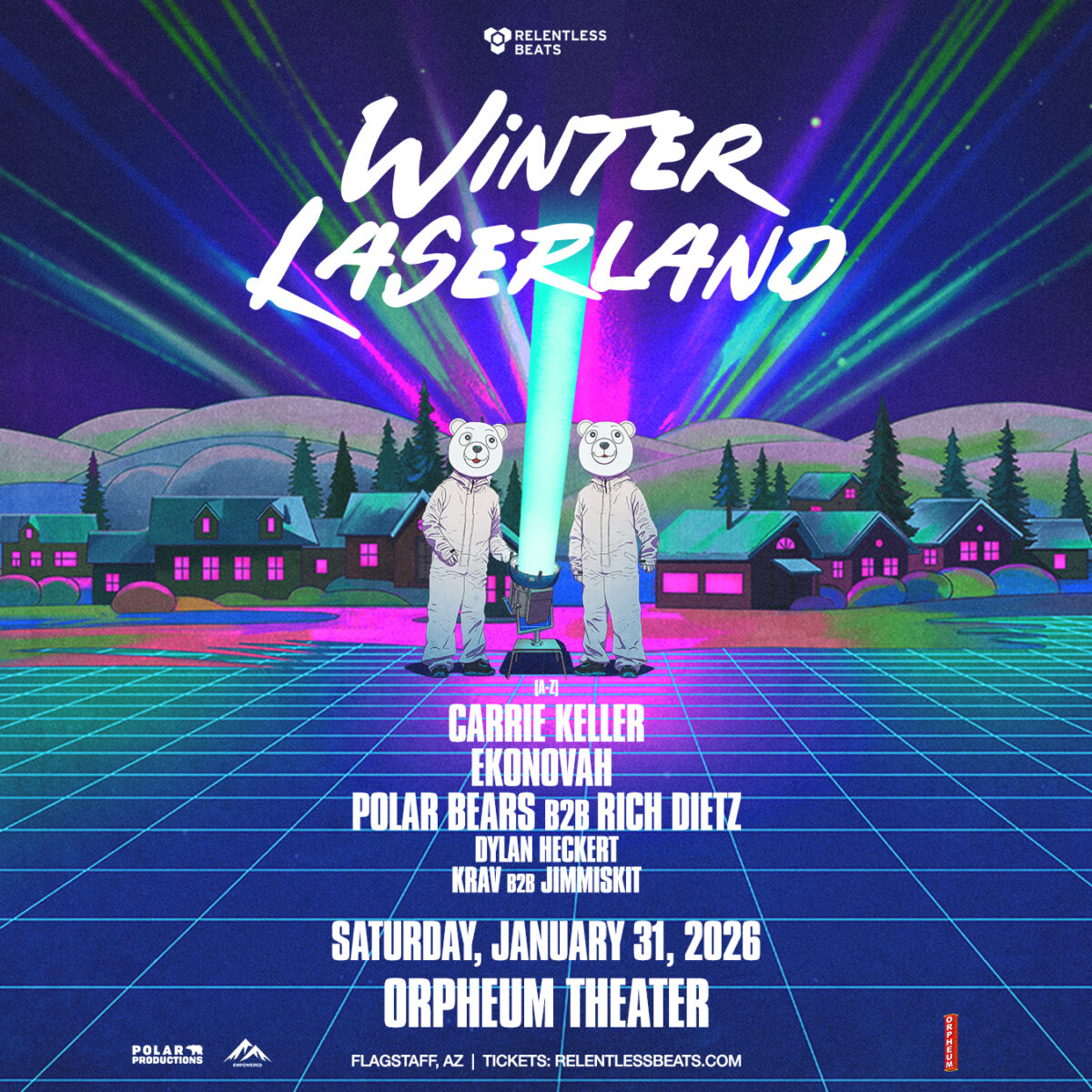 Relentless Beats presents Winter Laserland ft. Carrie Keller, Ekonovah, Polar Bears b2b Rich DietZ & more on Saturday, January 31, 2026 at Orpheum Theater in Flagstaff, AZ. This show is 18+.